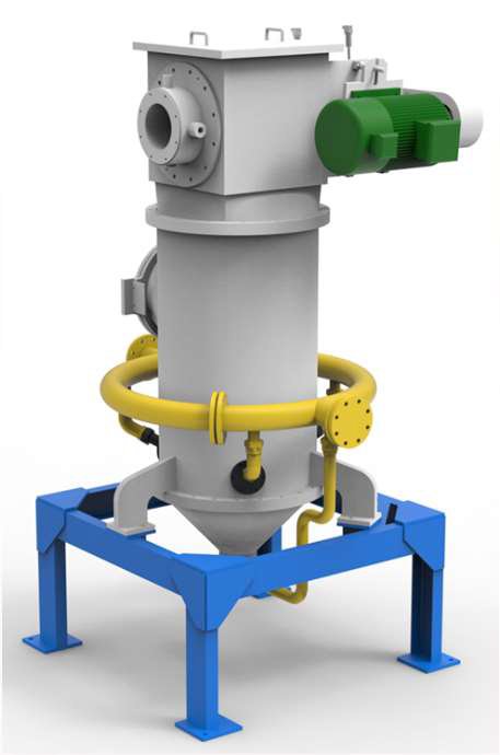 压缩空气经拉瓦尔喷咀加速成超音速气流后射入粉碎区使物料呈流态化(气流膨胀呈流态化床悬浮沸腾而互相碰撞),因此每一个颗粒具有相同的运动状态。在粉碎区,被加速的颗粒在各喷咀交汇点相互对撞粉碎。粉碎后的物料被上升气流输送至分级区,由水平布置的分级轮筛选出达到粒度要求的细粉,未达到粒度要求的粗粉返回粉碎区继续粉碎。合格细粉随气流进入高效旋风分离器得到收集,含尘气体经收尘器过滤净化后排入大气。